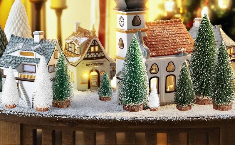Christmas village sets are made of fiber plastic and wooden base, which is durable, realistic in appearance and free from peculiar smell.They can be used next year.